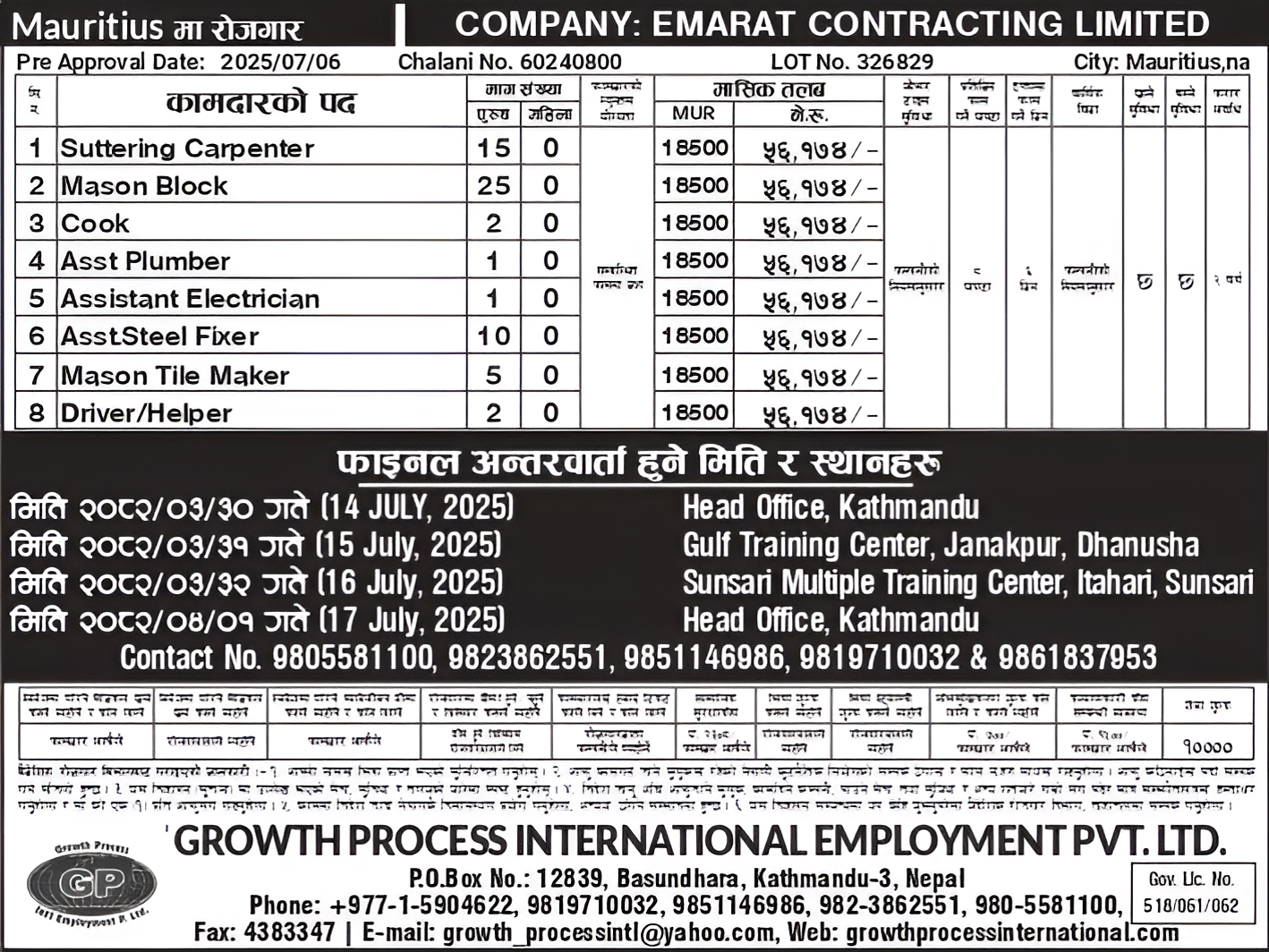 | Category: | SUTTERING CARPENTER, MASON BLOCK , COOK ,ASST PLUMBER , ELECTRICIAN , STEEL FI XER ,MASON TILE MAKER , DRIVER /HELPER |